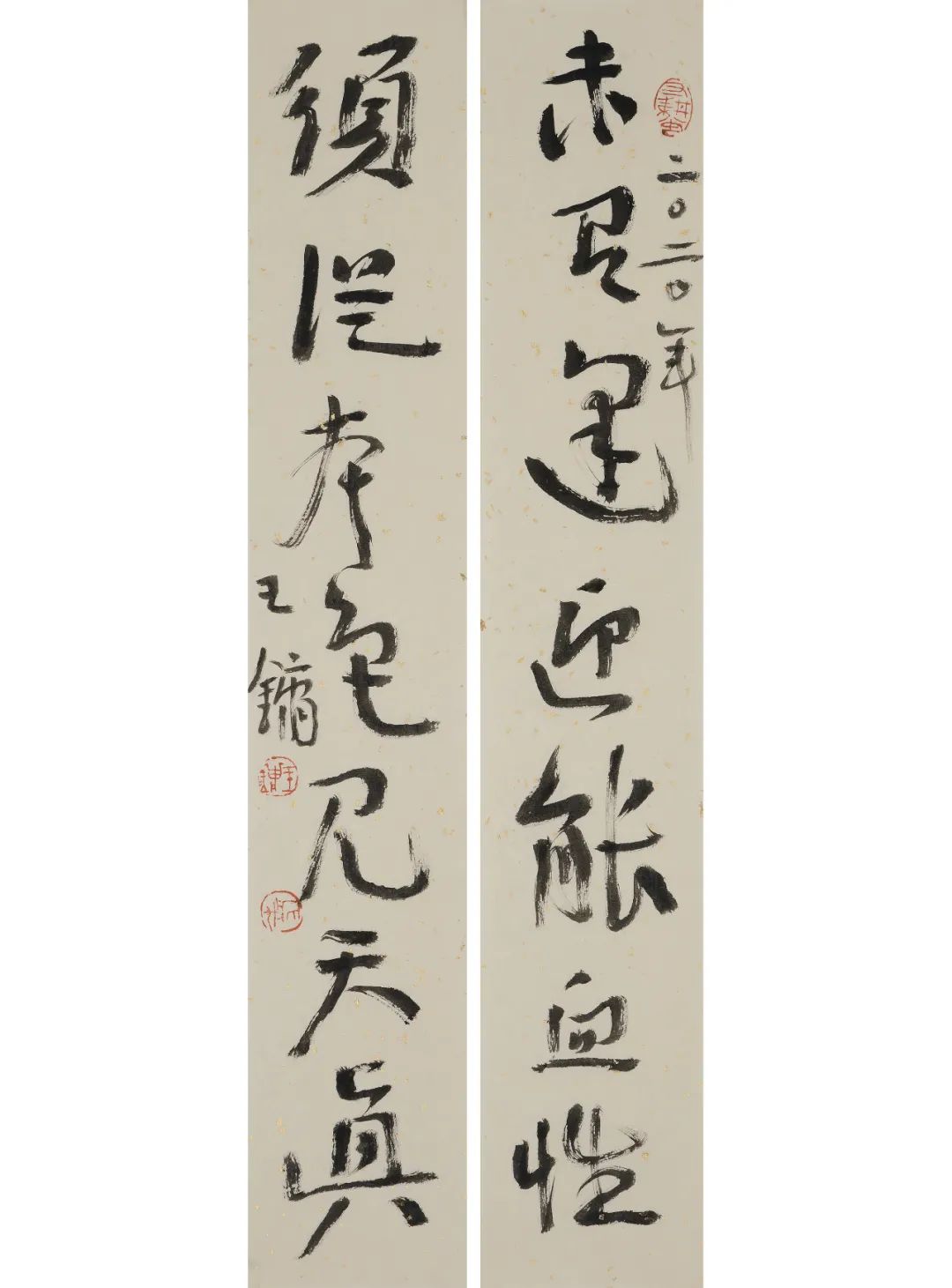 对联,大概是中国人最独特的文学形式之一。上下联文字相等,平仄相对,意义相成,音律相谐,圆满严密,具有代表性。把对联写成书作,又是中国人独特的艺术形式。中国艺术讲究融会贯通,此次展览王镛先生的书法作品,在注重书法创作的同时兼顾内容巧思,多自撰,涵盖读书观史、养志处世等佳句,可谓将其绝高的书艺和深厚博学的文学修养完美地结合。
